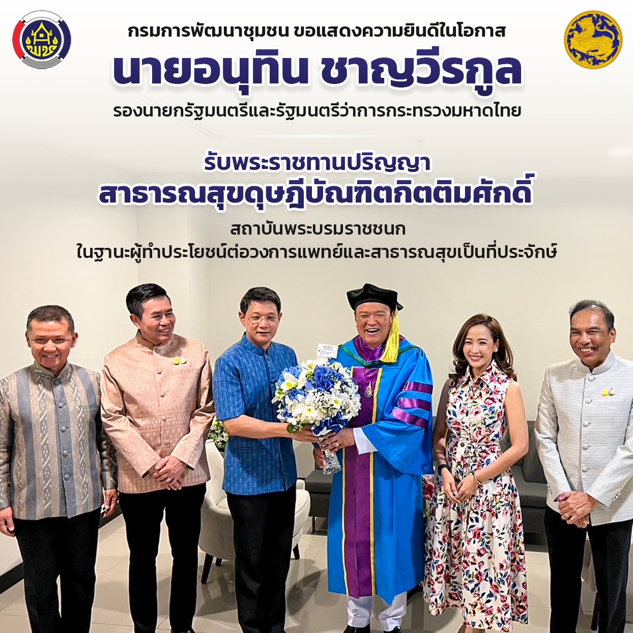 กรมการพัฒนาชุมชน ขอแสดงความยินดีในโอกาส นายอนุทิน ชาญวีรกูล รองนายกรัฐมนตรีและรัฐมนตรีว่าการกระทรวงมหาดไทย รับพระราชทานปริญญาสาธารณสุขดุษฎีบัณฑิตกิตติมศักดิ์ สถาบันพระบรมราชชนกในฐานะผู้ทำประโยชน์ต่อวงการแพทย์และสาธารณสุขเป็นที่ประจักษ์
