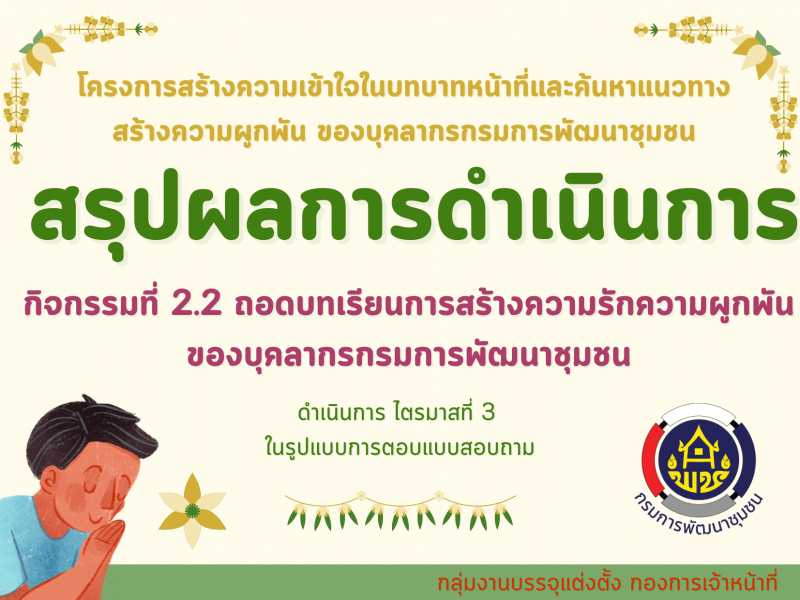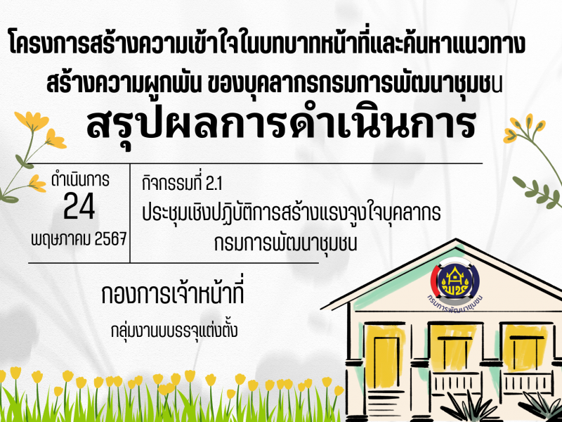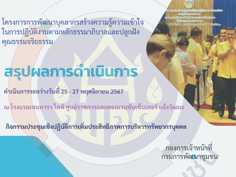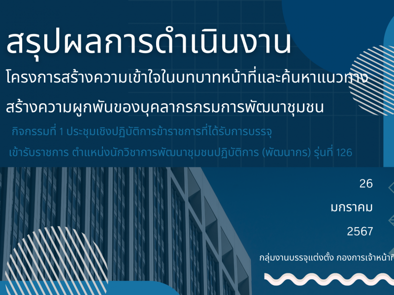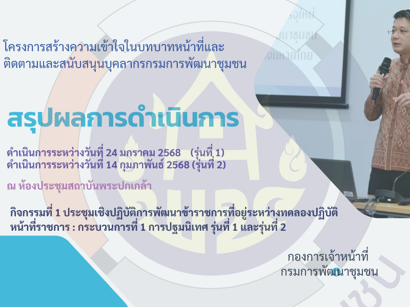 สรุปผลการดำเนินงานโครงการสร้างความเข้าใจในบทบาทหน้าที่และติดตามและสนับสนุนบุคลากรกรมการพัฒนาชุมชน กิจกรรมที่ 1 ประชุมเชิงปฏิบัติการพัฒนาข้าราชการที่อยู่ในระหว่างทดลองปฏิบัติหน้าที่ราชการ : กระบวนการที่ 1 การปฐมนิเทศ รุ่นที่ 1 และรุ่นที่ 2